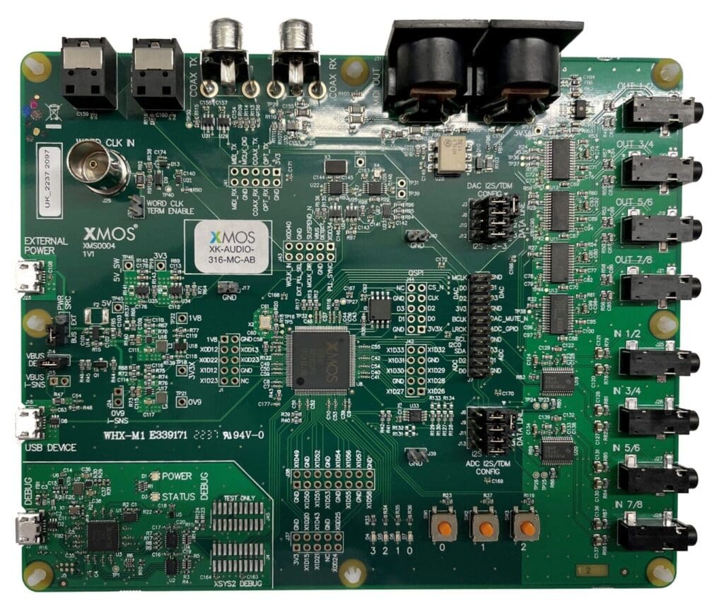 The xcore.ai evaluation kit allows testing in multiple application scenarios and provides a good general software development board for evaluating xcore.ai.